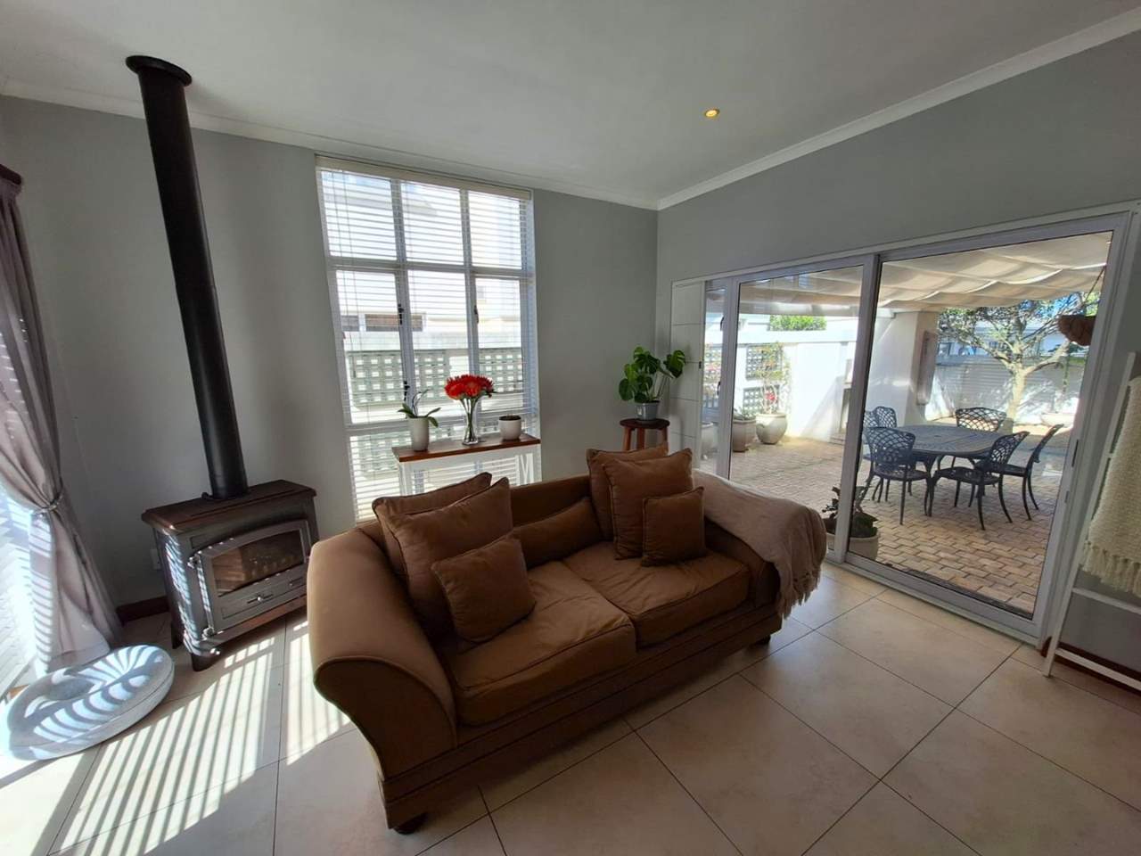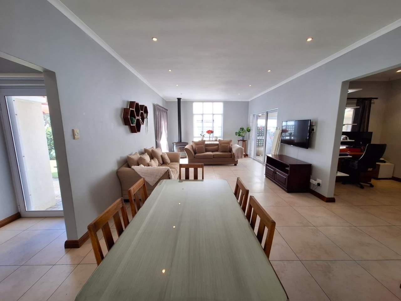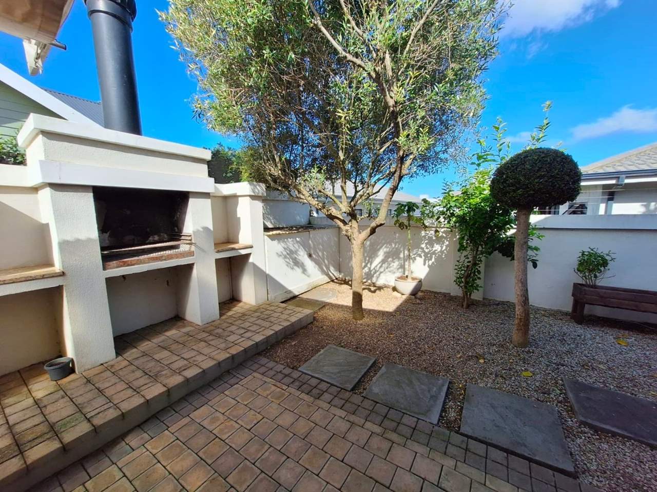 The open-plan living area combines a spacious lounge, dining area, and a large country-inspired kitchen featuring granite countertops and ample cabinetry. A wood burning fireplace adds warmth and character, while sliding doors open to a covered patio with built-in braai, overlooking a neat, established back garden, ideal for relaxed outdoor living. The main bedroom enjoys direct access to this tranquil outdoor space.
