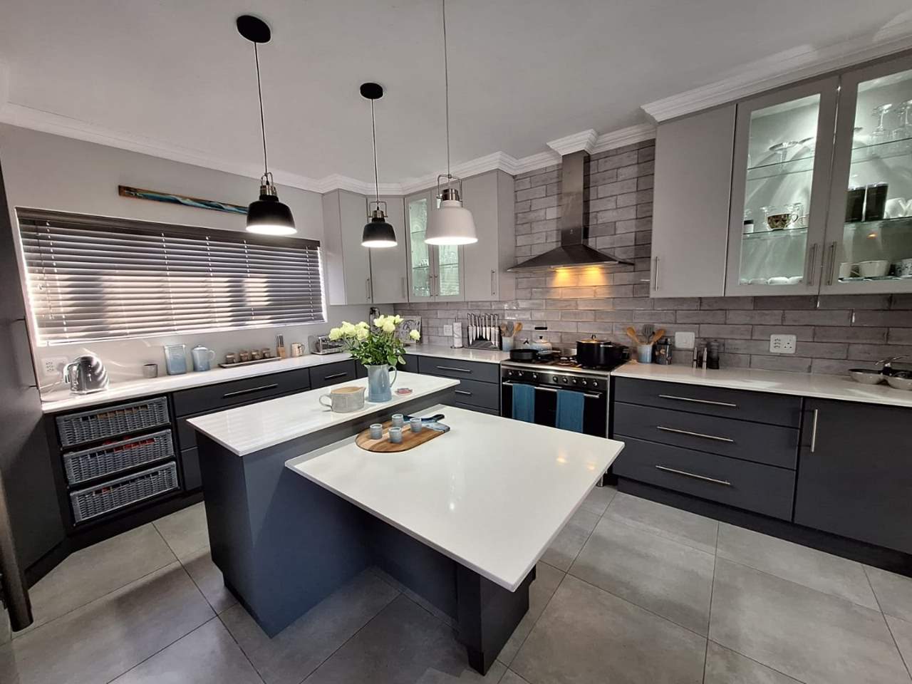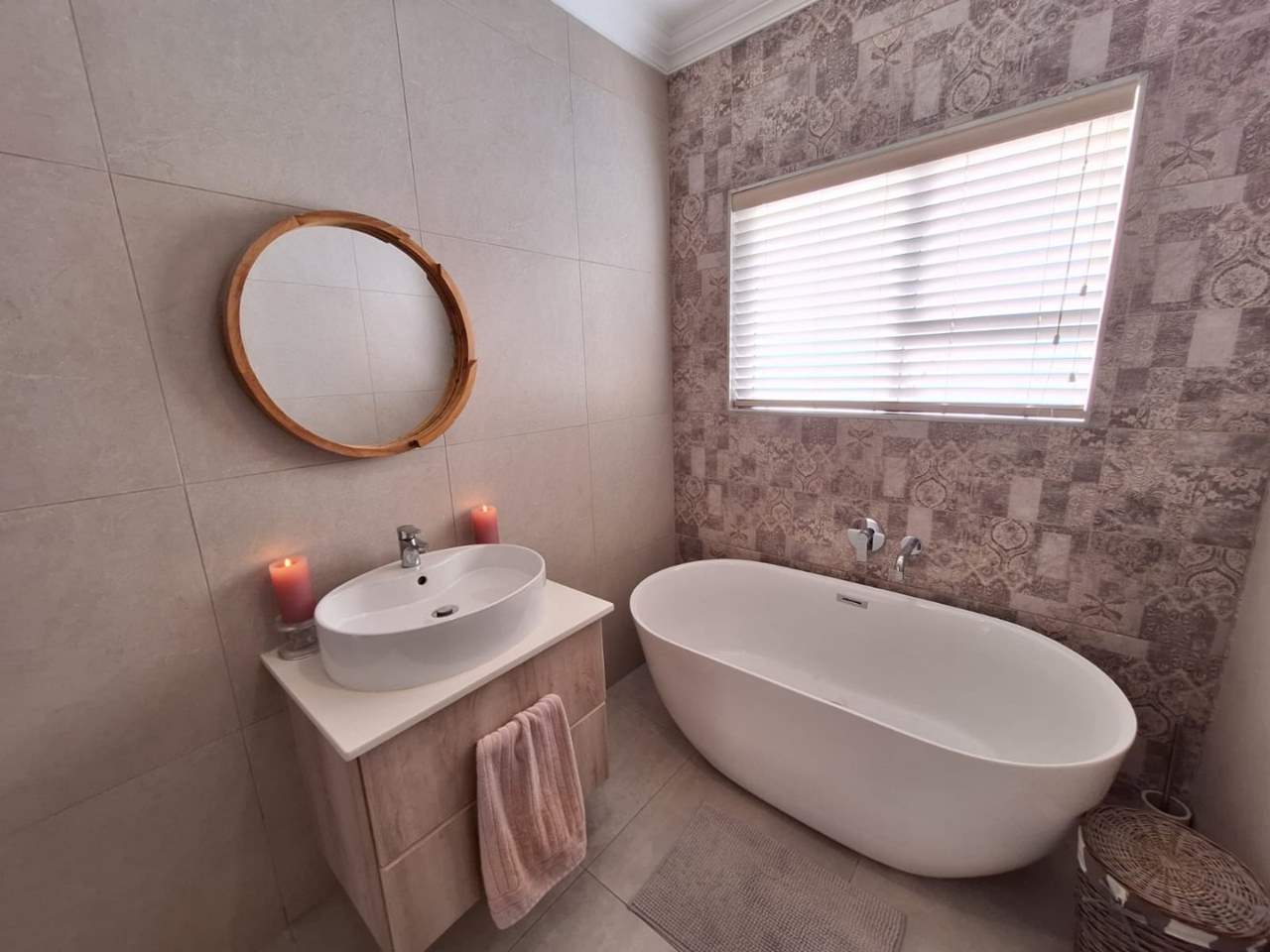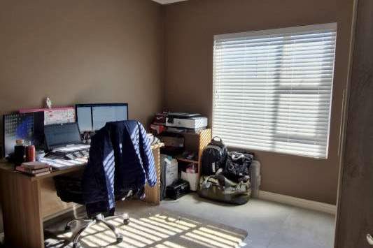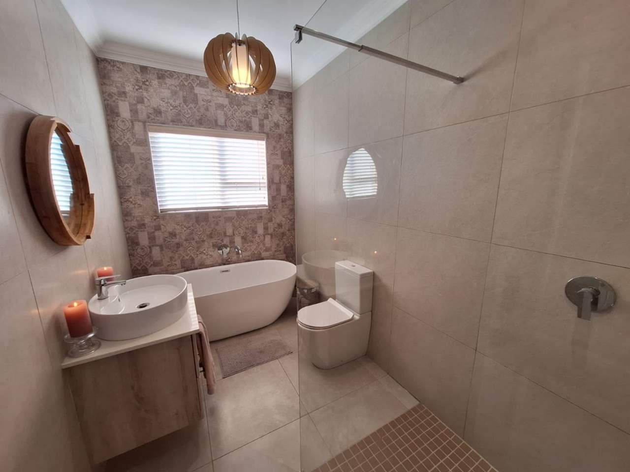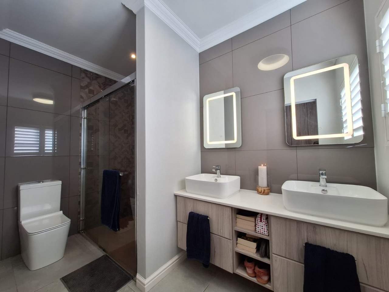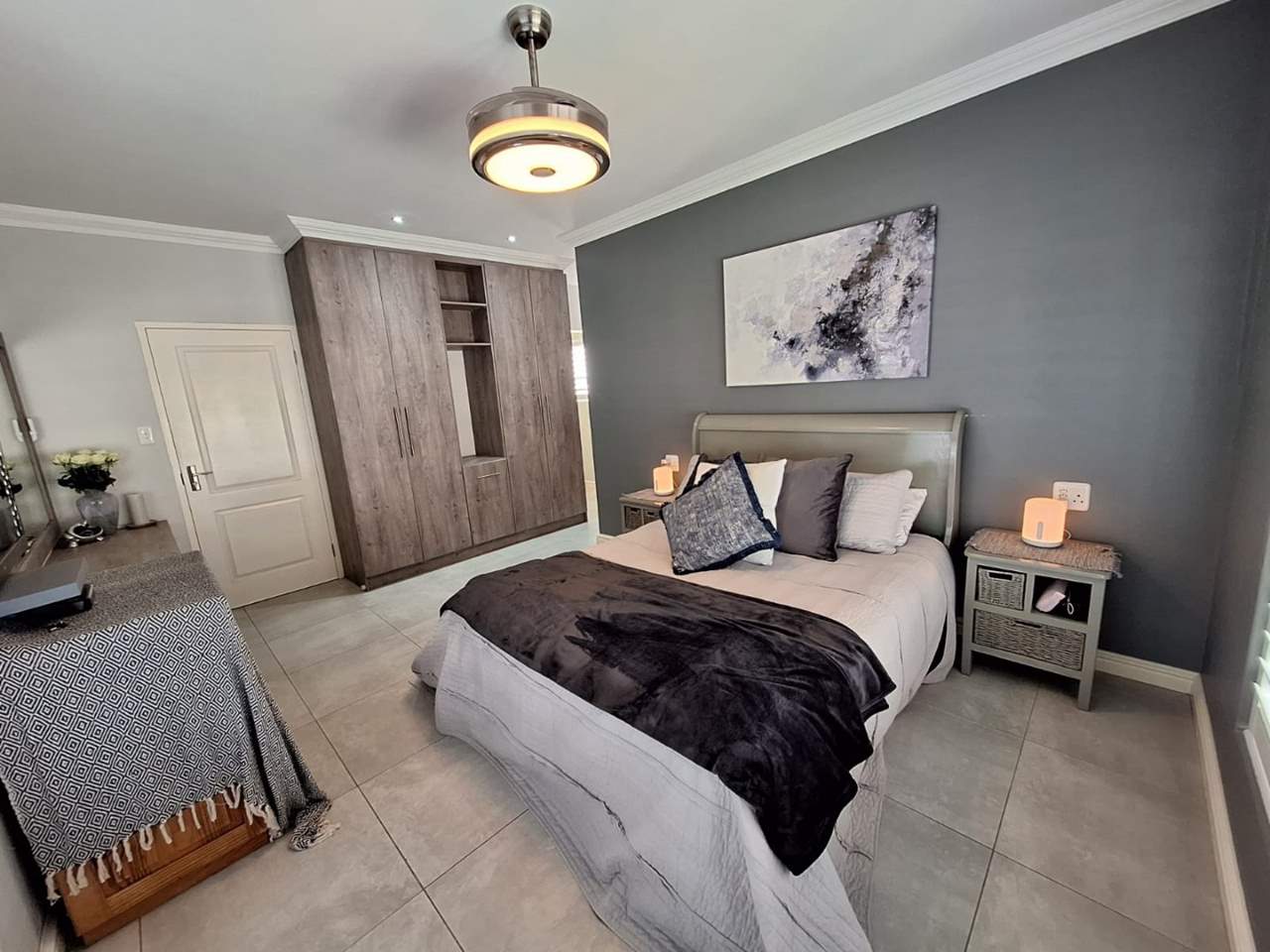 The bedroom wing of the home ensures privacy and comfort. The master suite is generously sized, with space for a king bed, ample cupboards, and a modern en-suite bathroom fitted with a double vanity, large shower, and toilet. This suite enjoys direct garden access, while stylish American shutters provide both sophistication and security. The two additional bedrooms are light-filled, fitted with built-in cupboards, and serviced by a full family bathroom that also functions as a guest facility when entertaining.