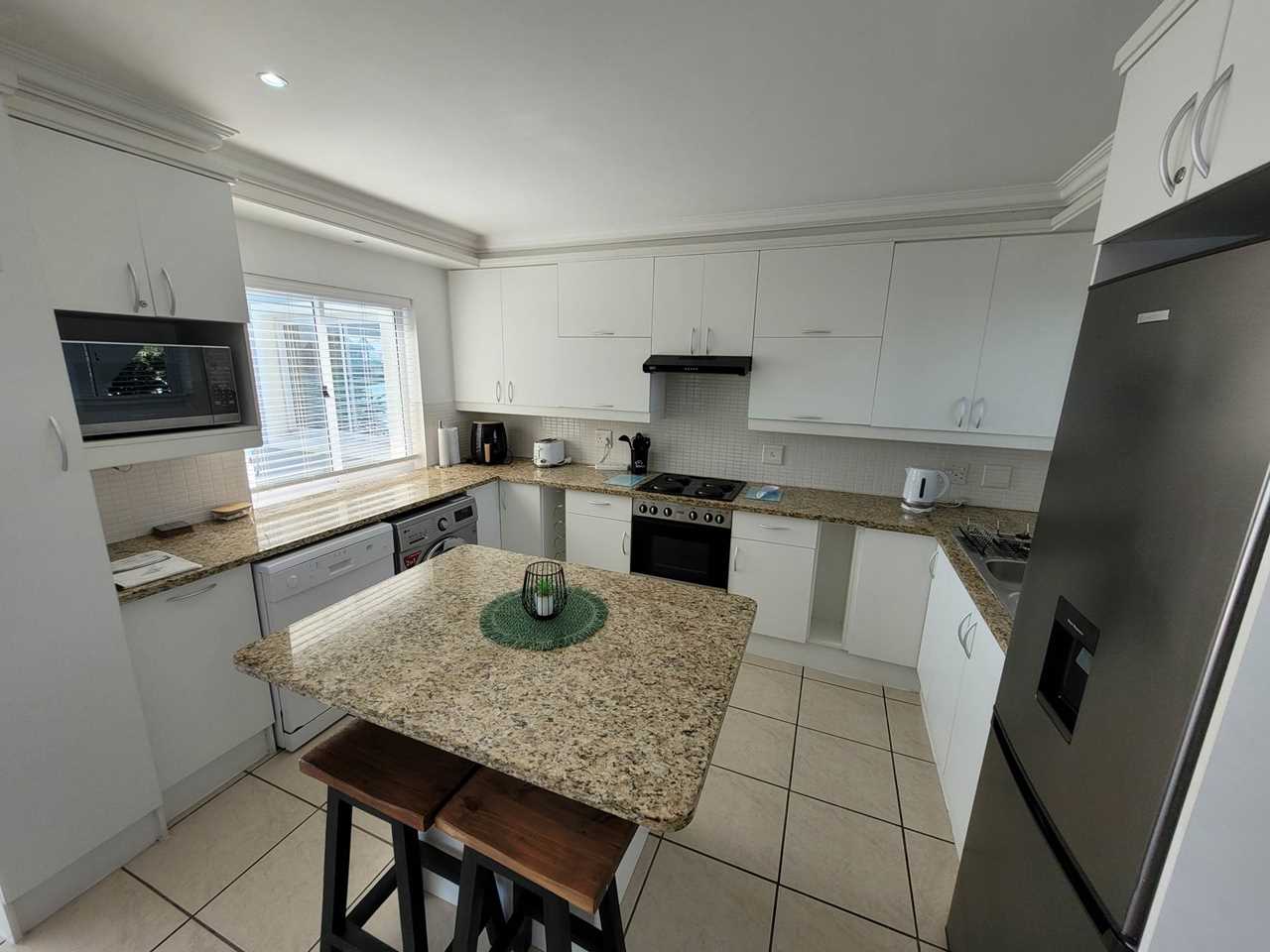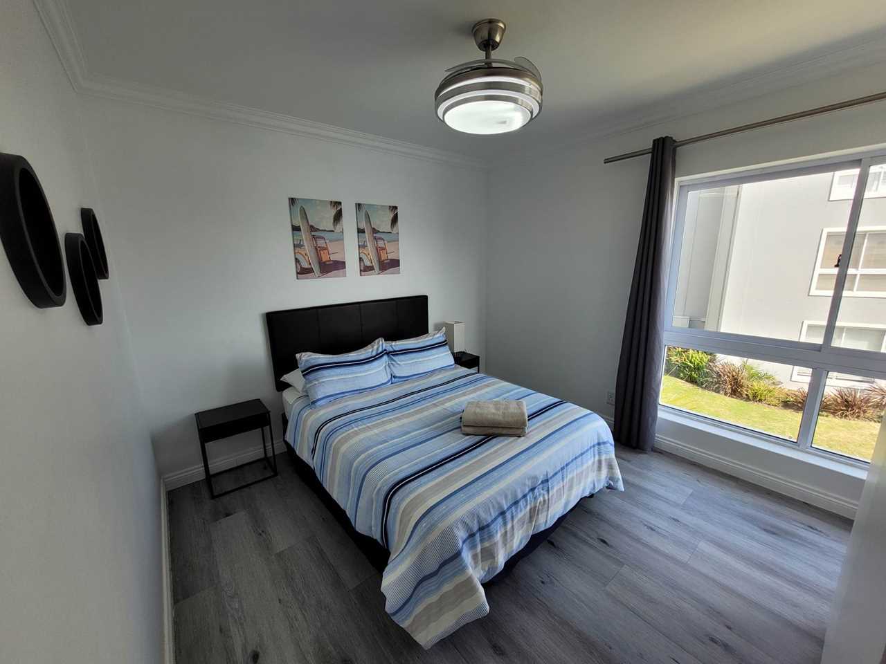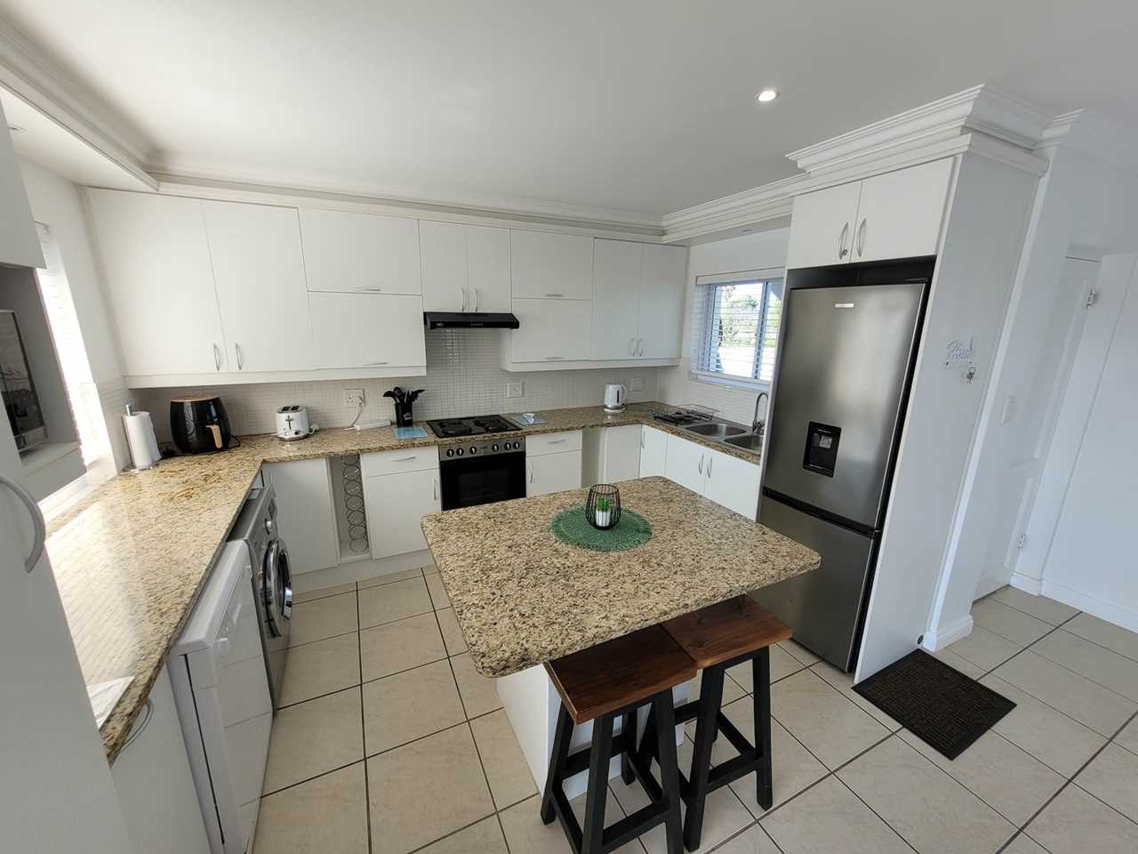 The apartment features a generous open-plan living area that flows effortlessly onto a large, covered patio via stackable sliding doors – ideal for entertaining or relaxing while soaking up the tranquil surroundings. The patio includes a brand-new built-in stainless steel braai for ultimate outdoor living.