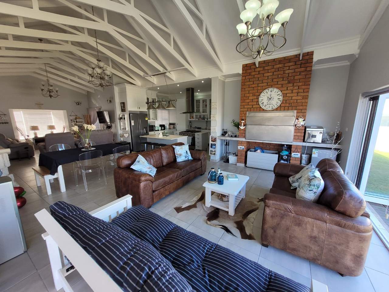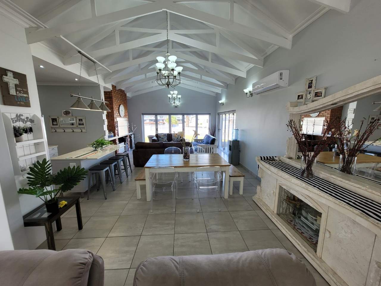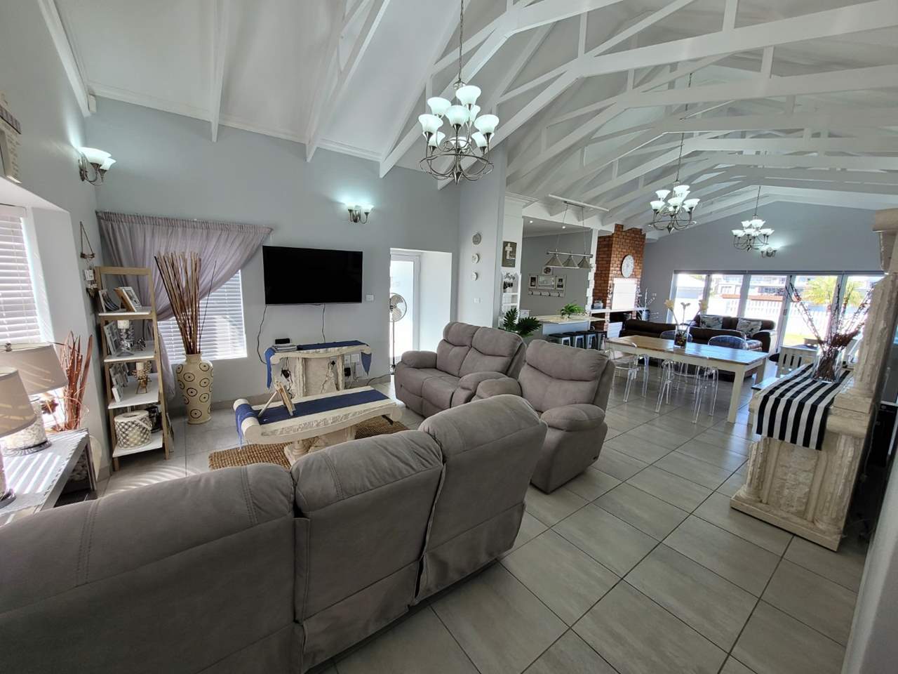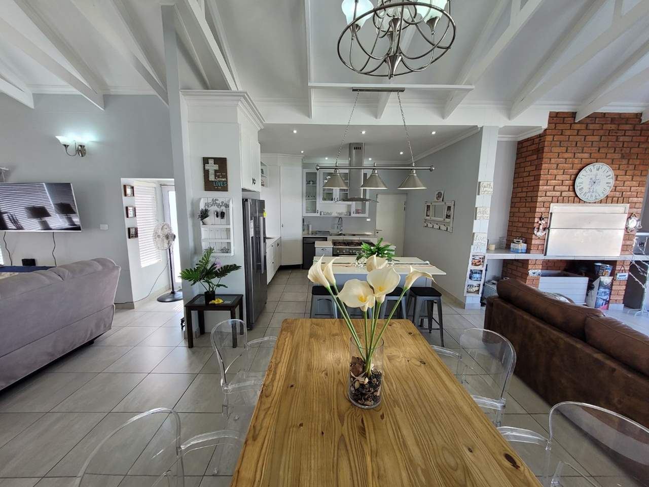 Inside, the home boasts a spacious open-plan design with high, exposed truss ceilings that enhance the sense of light and space. The open living area includes a TV lounge, dining room, and an entertainment area with a built-in stainless steel braai and two sets of stacking doors — seamlessly connecting indoor and outdoor living spaces.