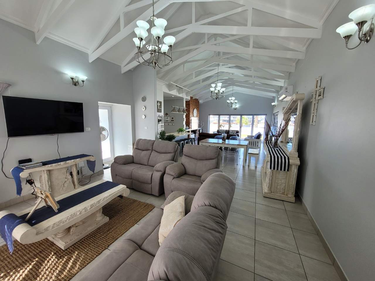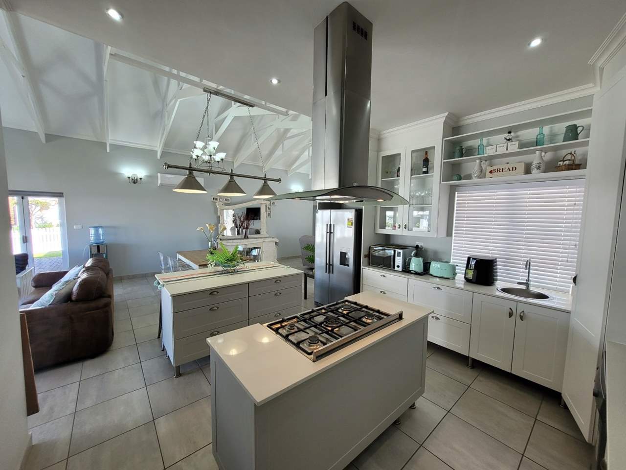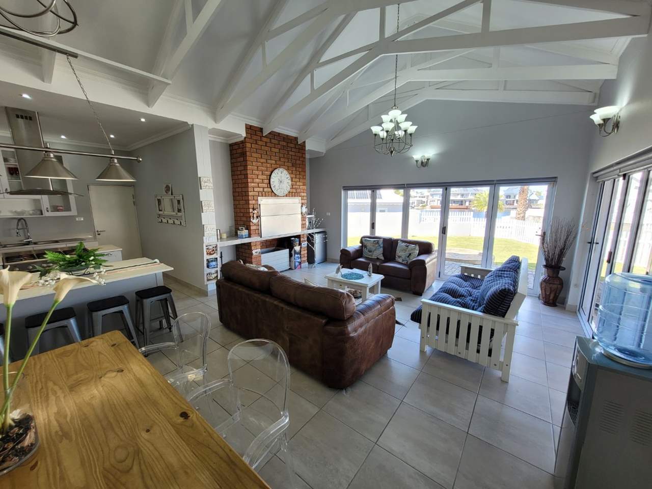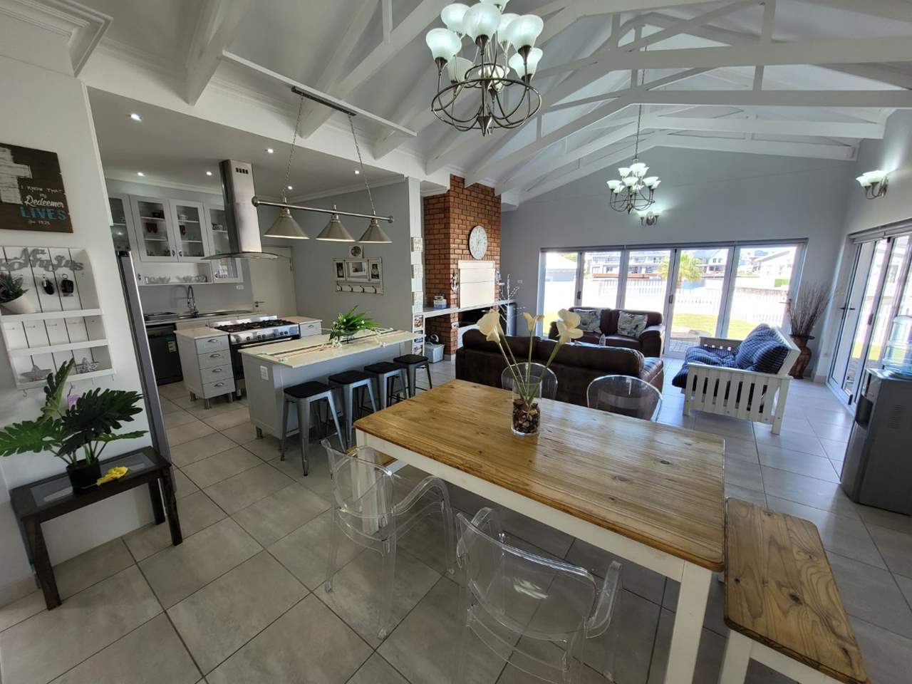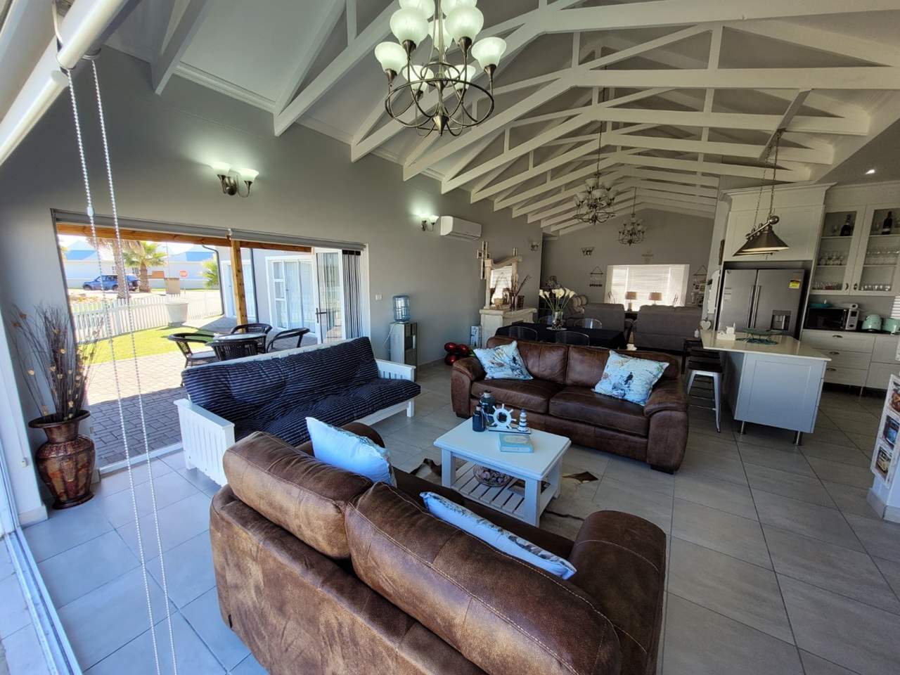 Inside, the home boasts a spacious open-plan design with high, exposed truss ceilings that enhance the sense of light and space. The open living area includes a TV lounge, dining room, and an entertainment area with a built-in stainless steel braai and two sets of stacking doors — seamlessly connecting indoor and outdoor living spaces.