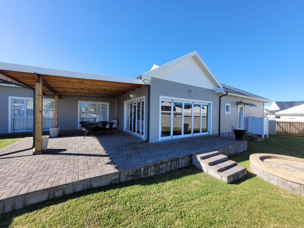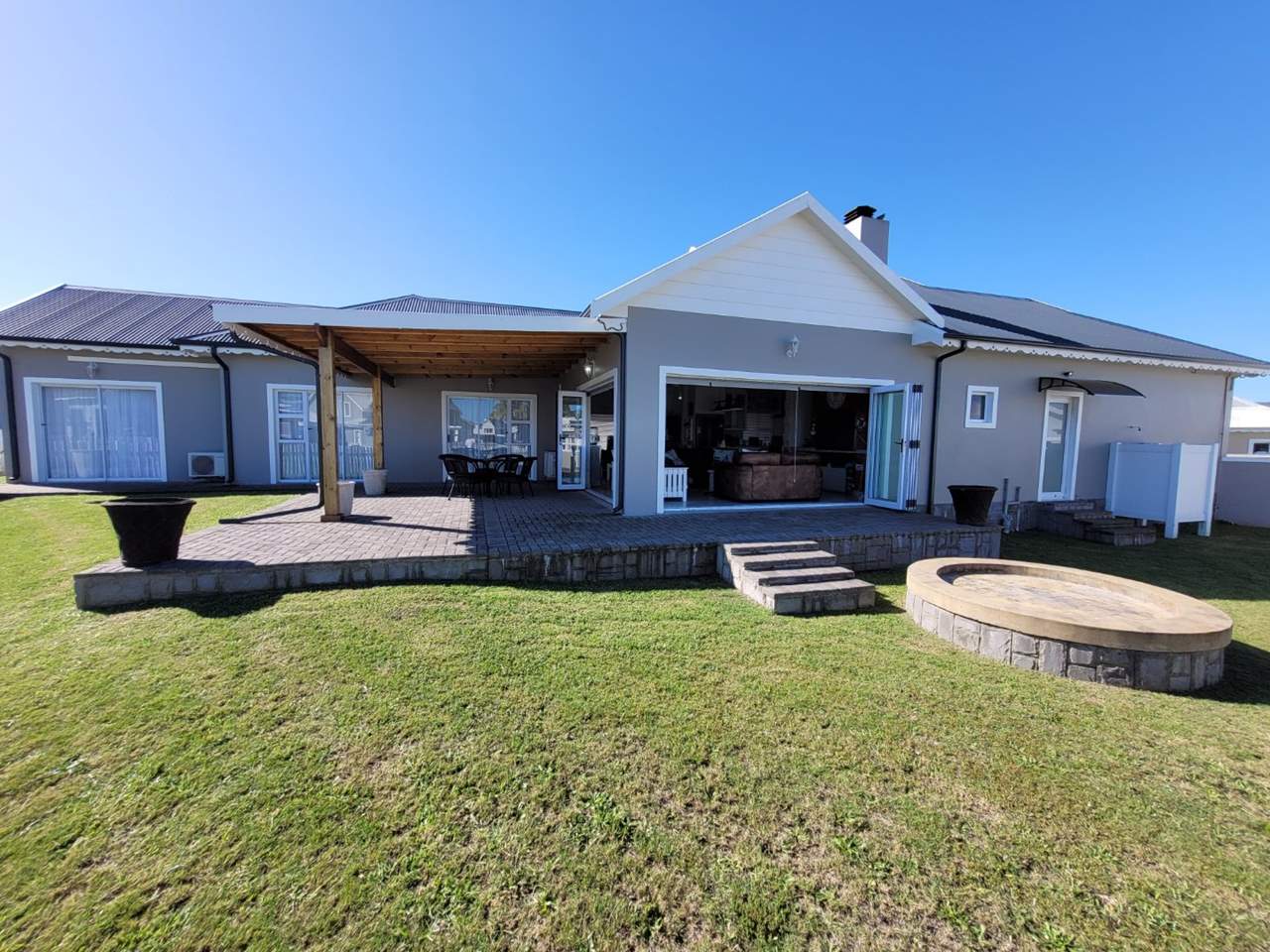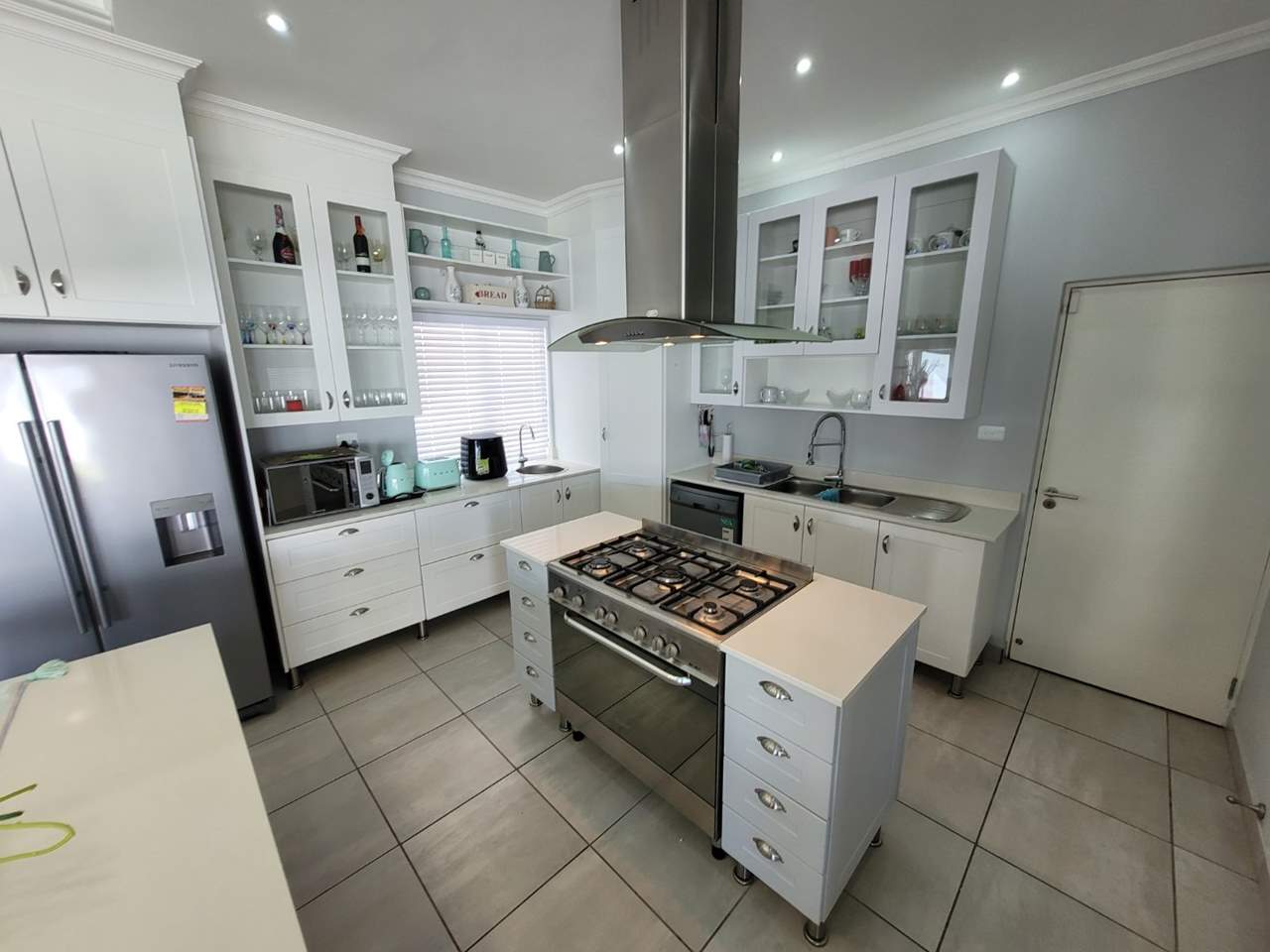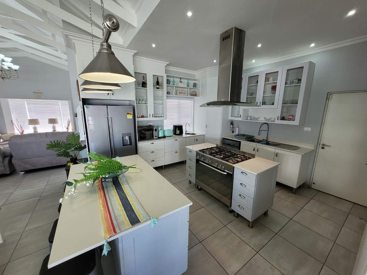Inside, the home boasts a spacious open-plan design with high, exposed truss ceilings that enhance the sense of light and space. The open living area includes a TV lounge, dining room, and an entertainment area with a built-in stainless steel braai and two sets of stacking doors — seamlessly connecting indoor and outdoor living spaces.