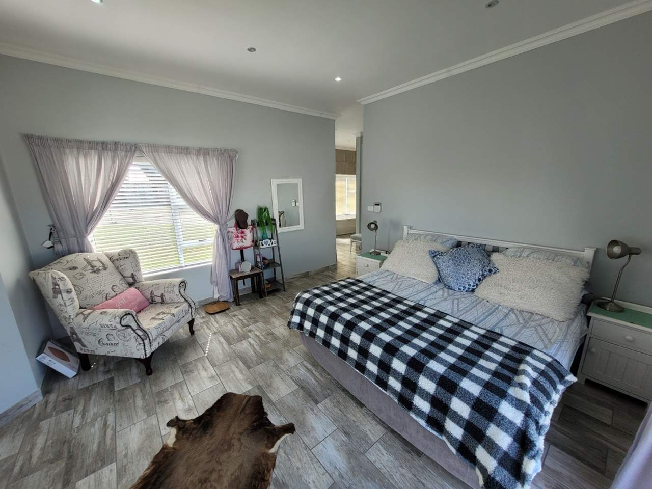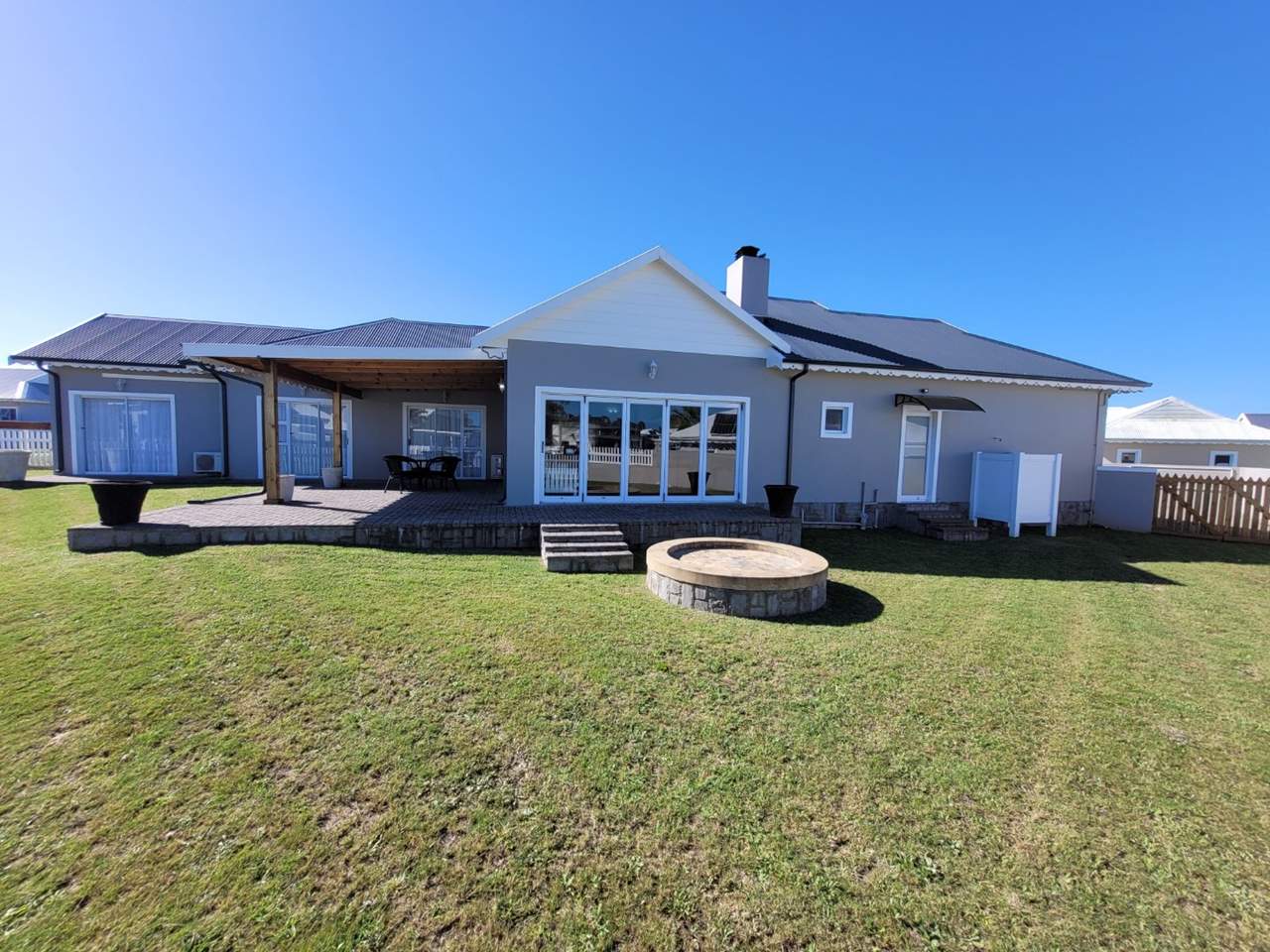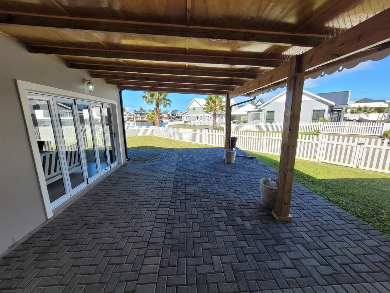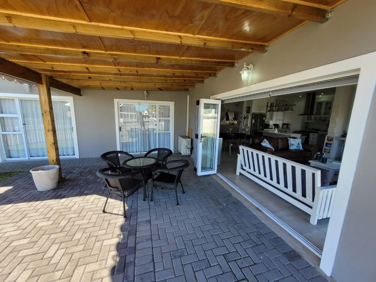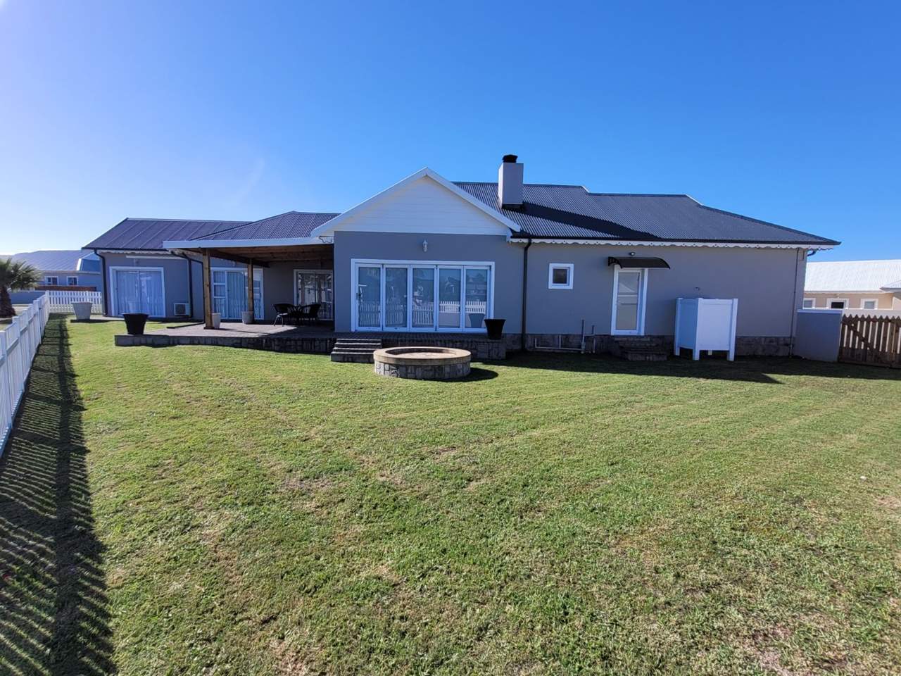 Inside, the home boasts a spacious open-plan design with high, exposed truss ceilings that enhance the sense of light and space. The open living area includes a TV lounge, dining room, and an entertainment area with a built-in stainless steel braai and two sets of stacking doors — seamlessly connecting indoor and outdoor living spaces.