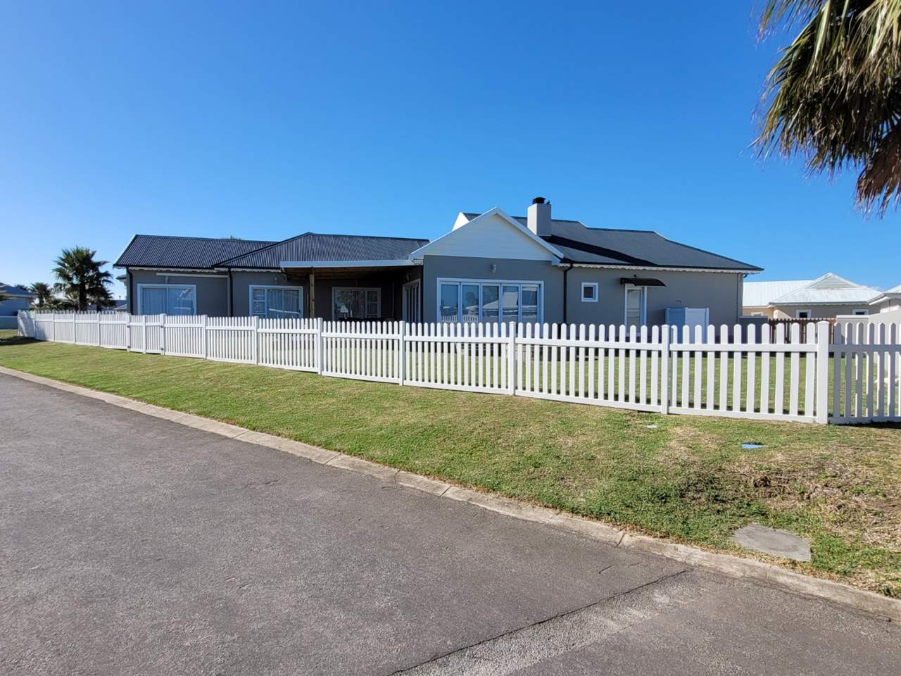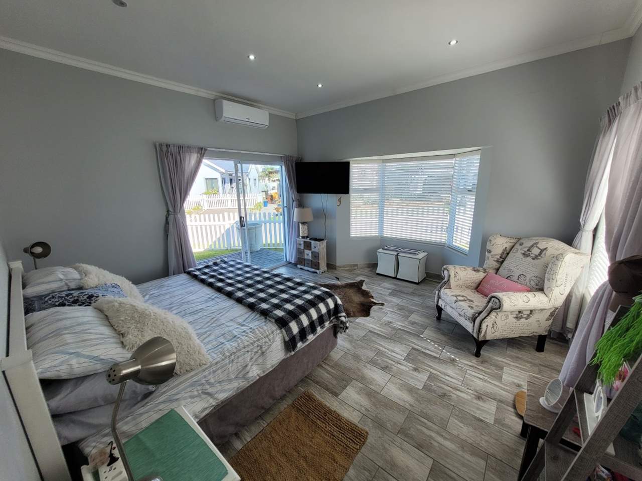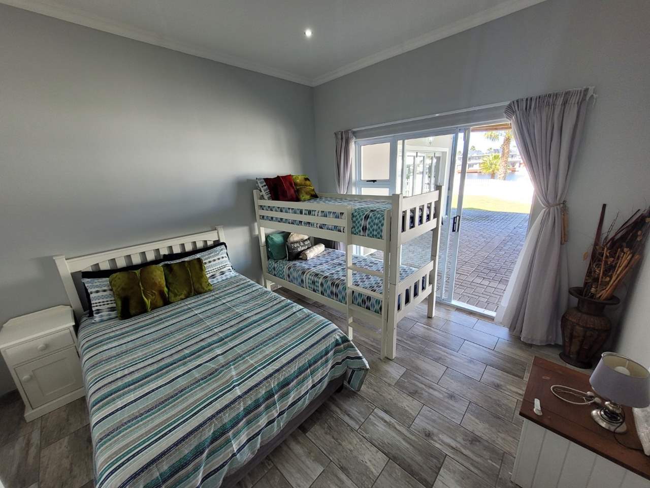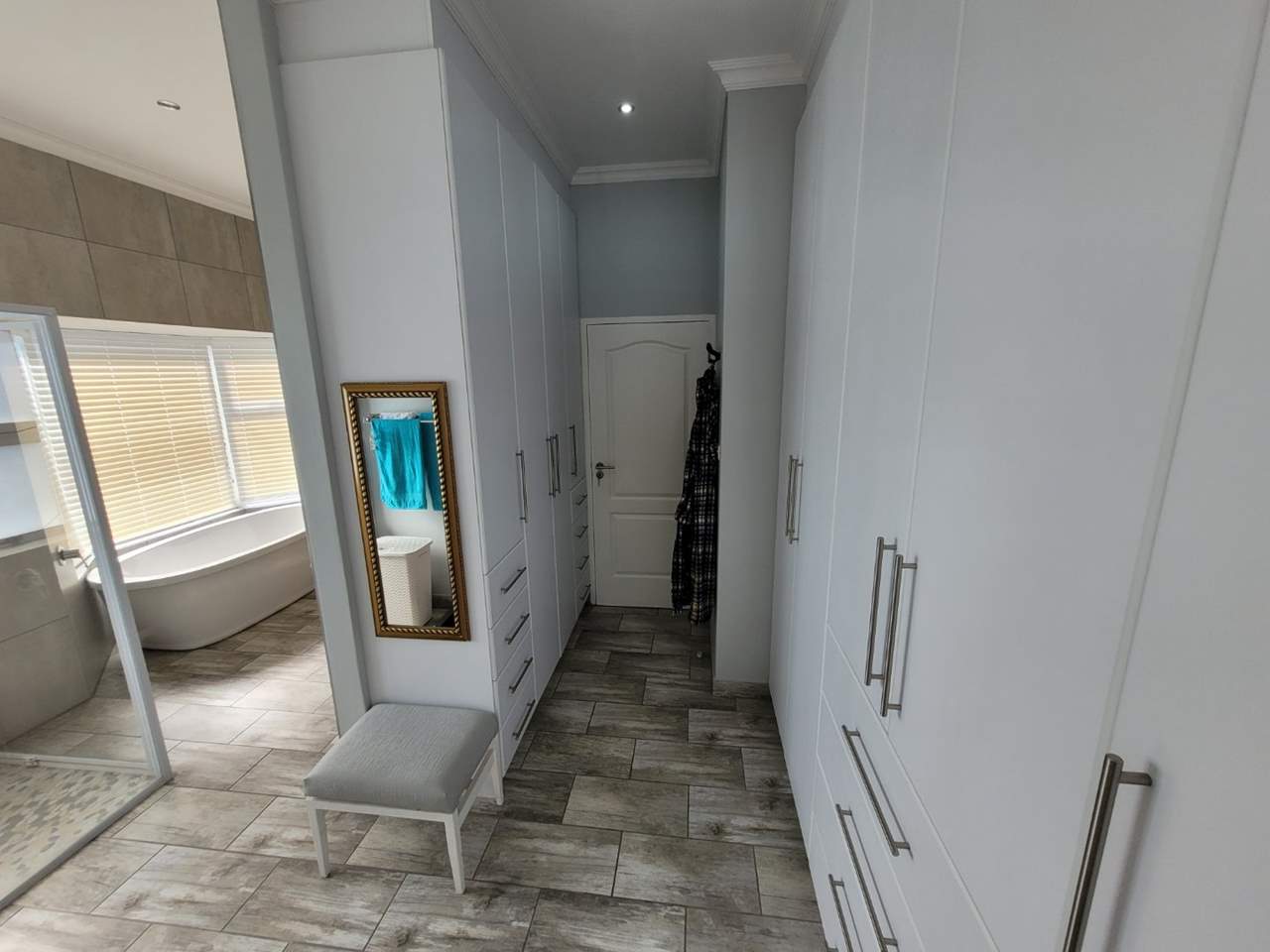 Inside, the home boasts a spacious open-plan design with high, exposed truss ceilings that enhance the sense of light and space. The open living area includes a TV lounge, dining room, and an entertainment area with a built-in stainless steel braai and two sets of stacking doors — seamlessly connecting indoor and outdoor living spaces.
