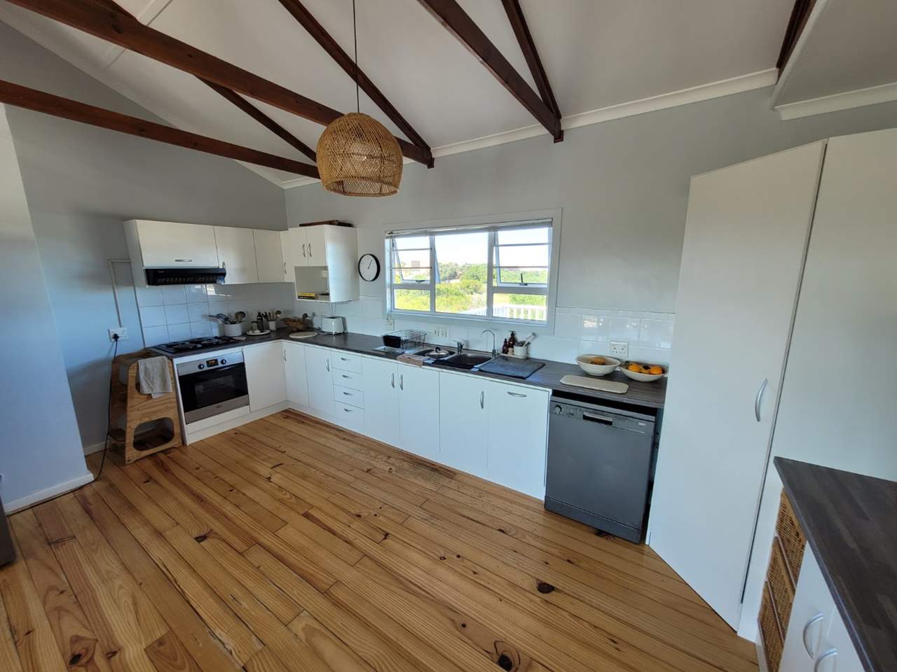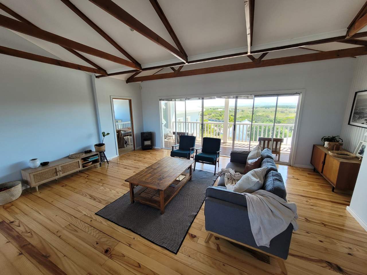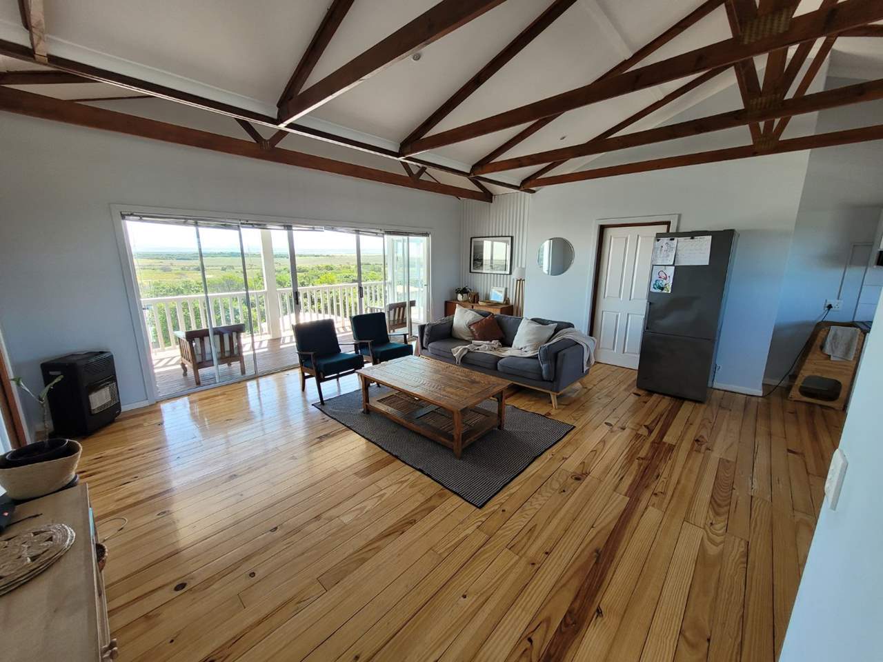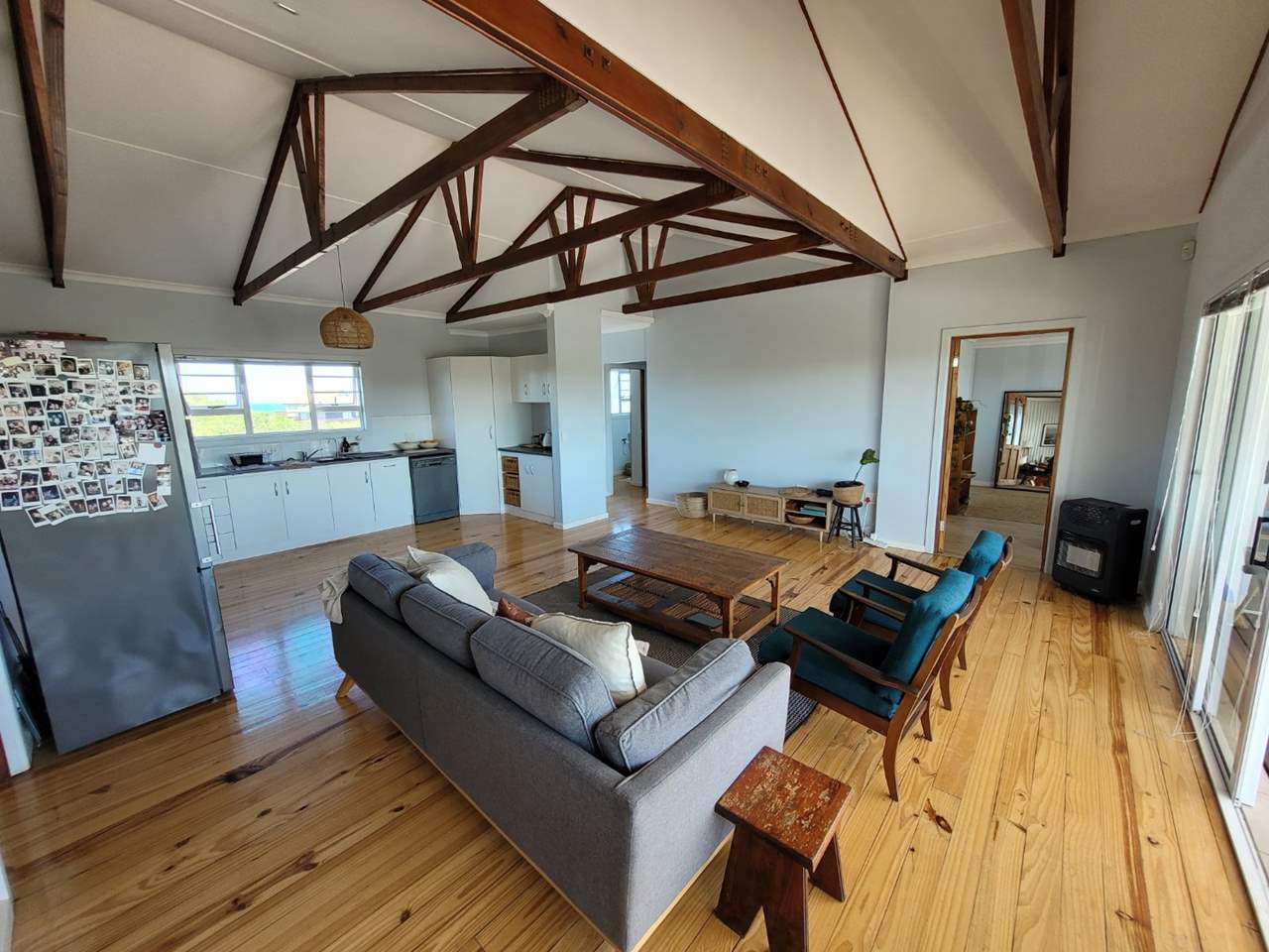 Open-plan lounge and kitchen with exposed trusses and beautiful wooden floors.