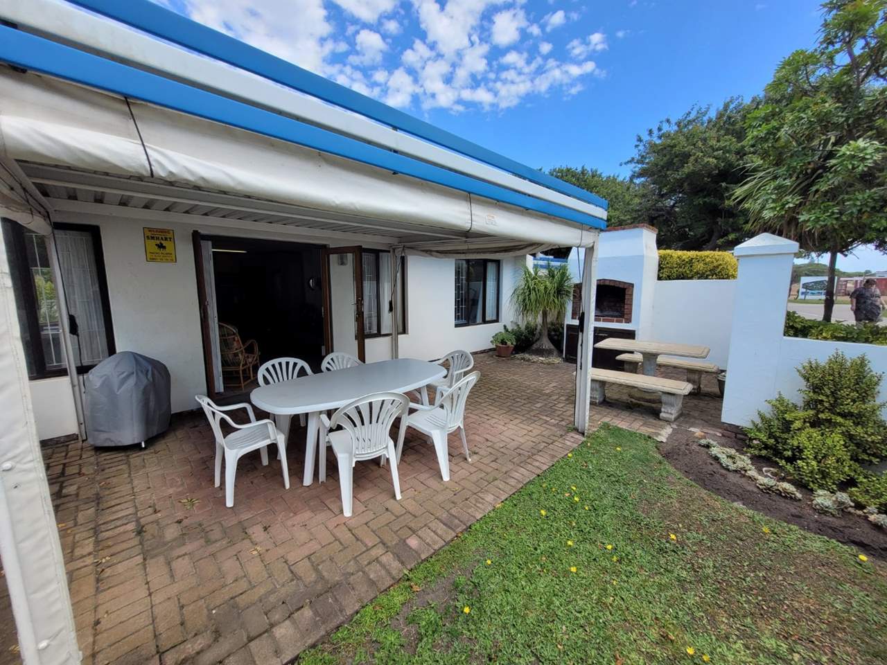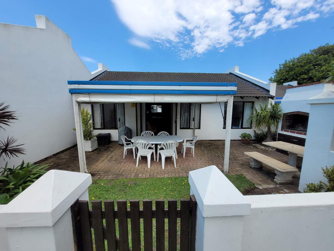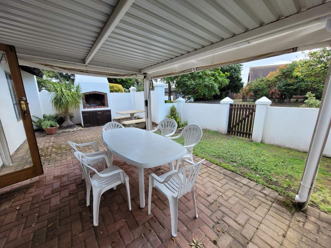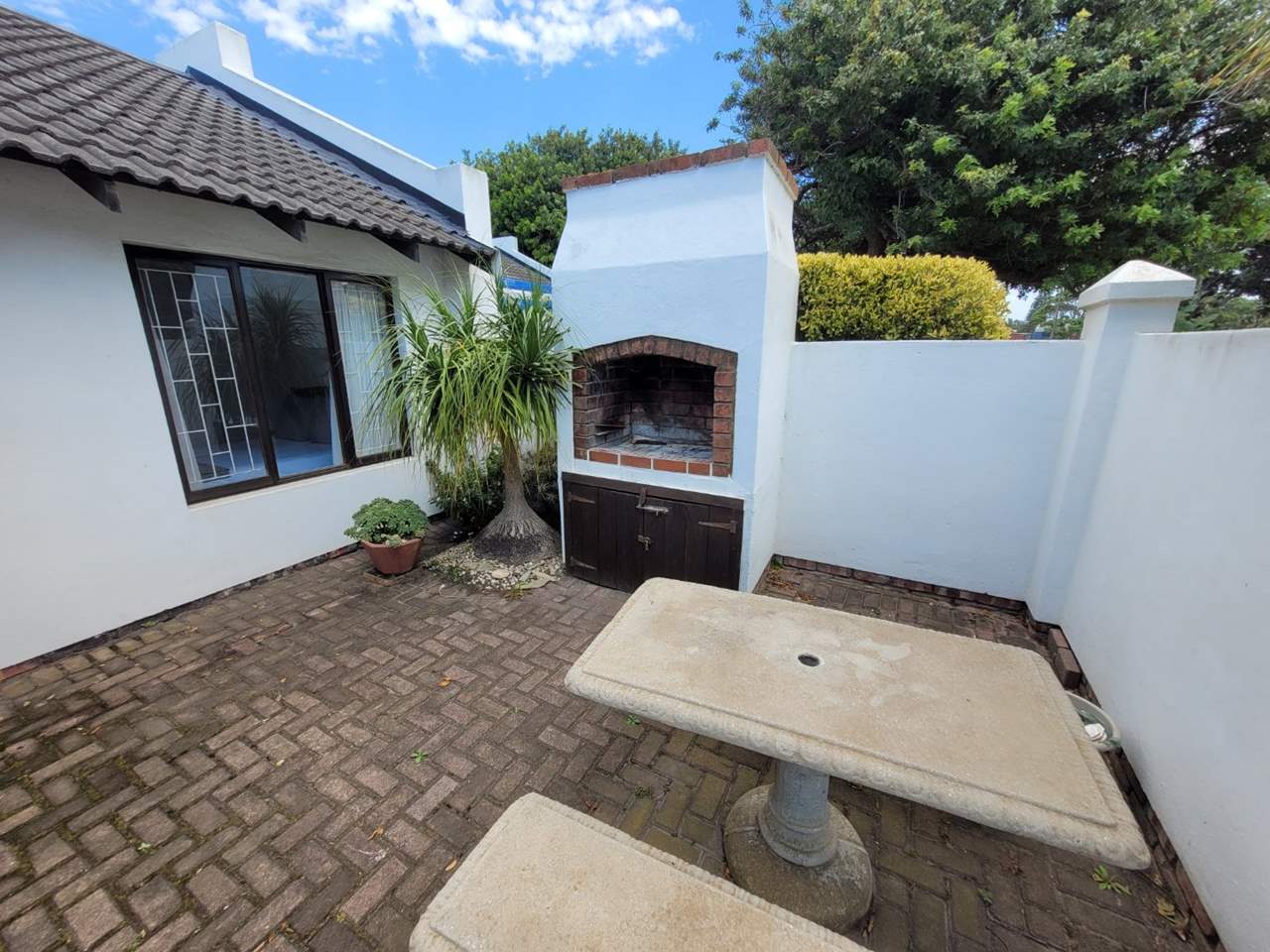 Featuring a large open-plan kitchen, lounge, and dining area. A covered patio opens to an enclosed yard with a built-in braai, creating the perfect space for outdoor entertaining.