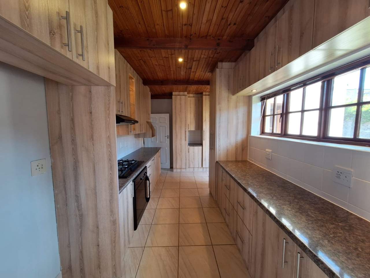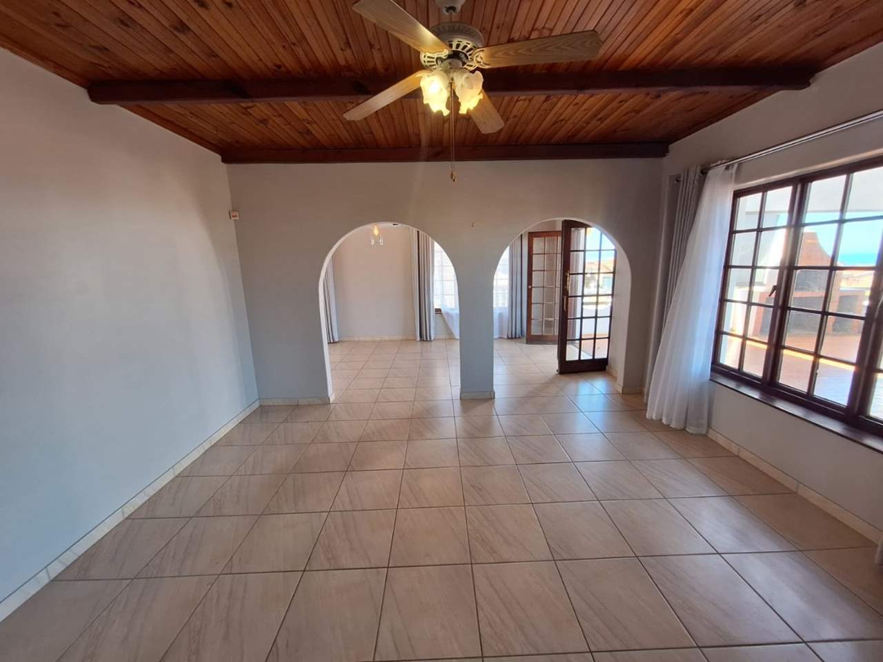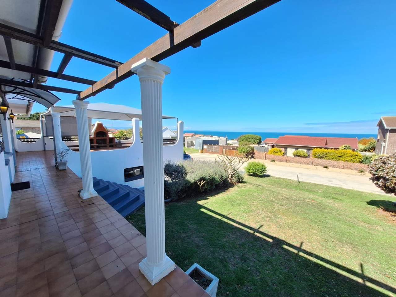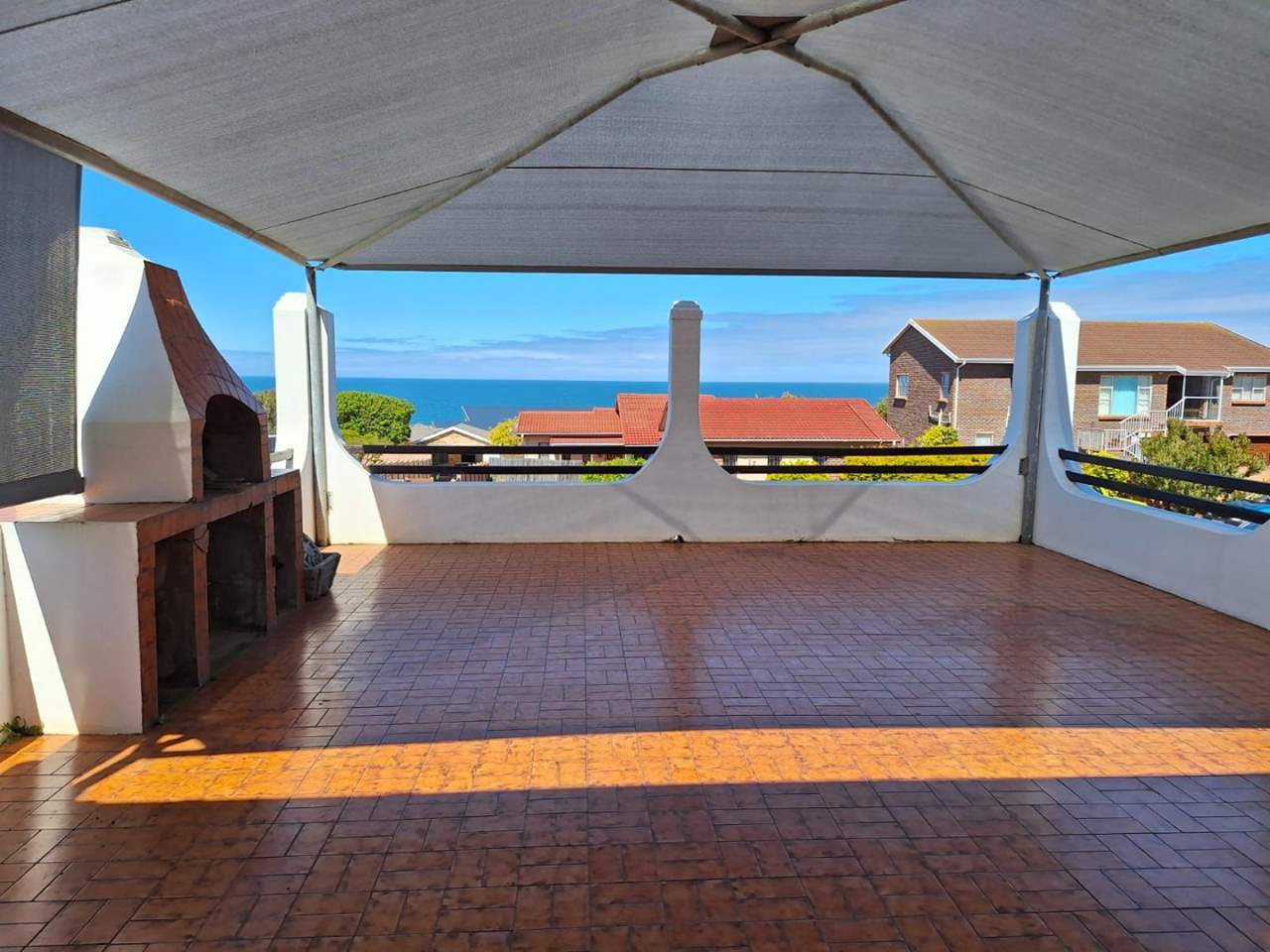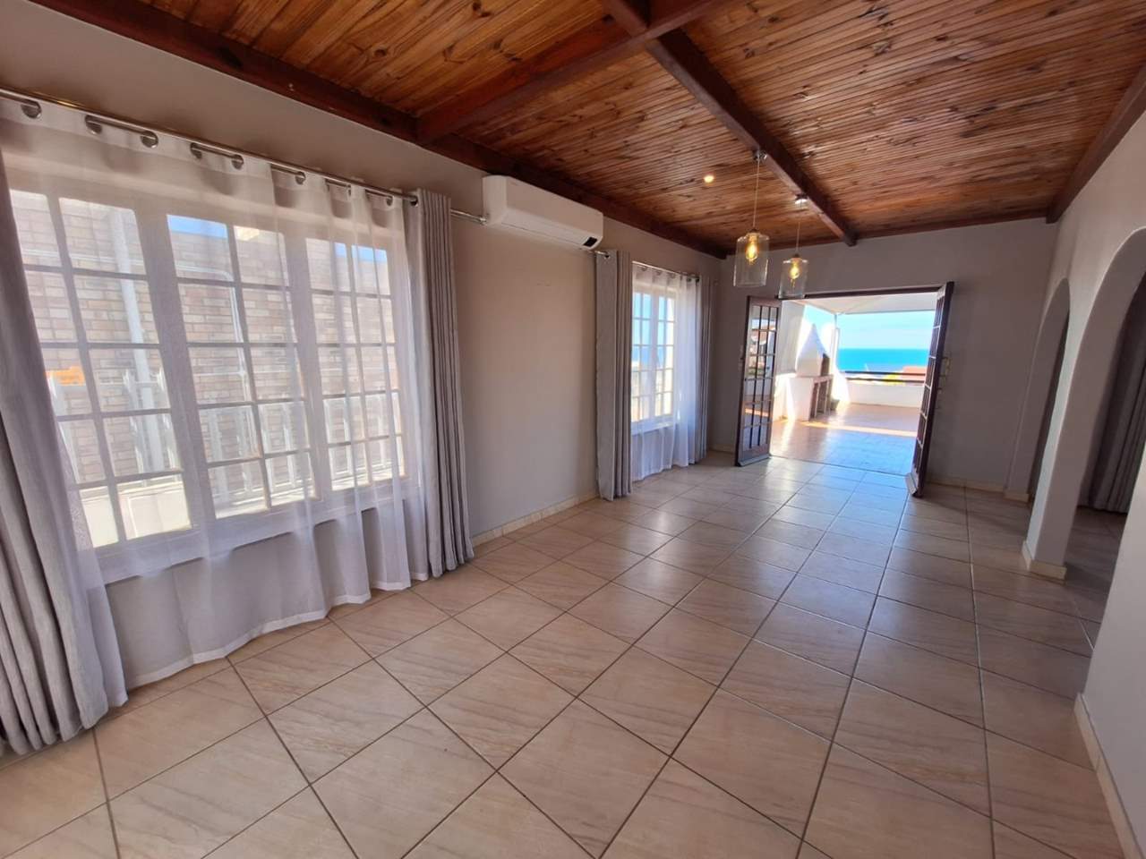 Outdoor living is where this property truly shines. The spacious patio overlooks the ocean and is fitted with a built-in braai and awning, perfect for entertaining or simply enjoying the view. The back garden is enclosed and easy to maintain, with added peace of mind from security beams.