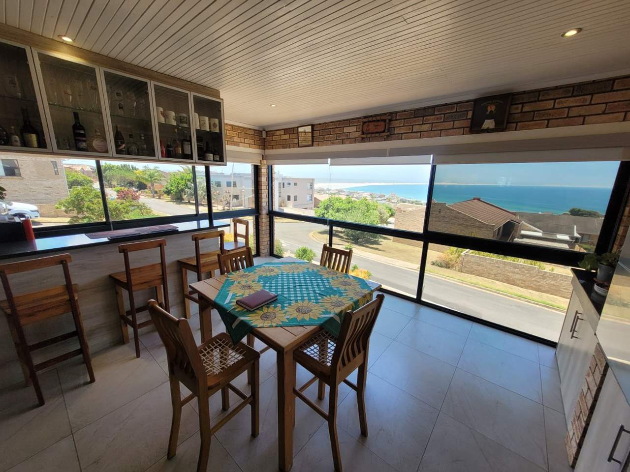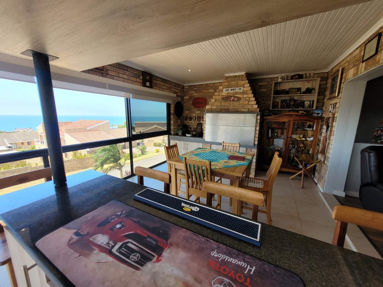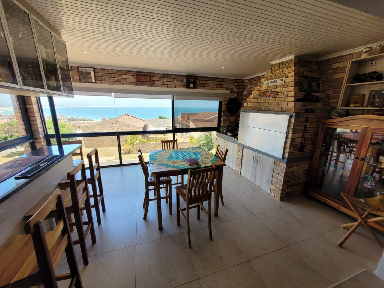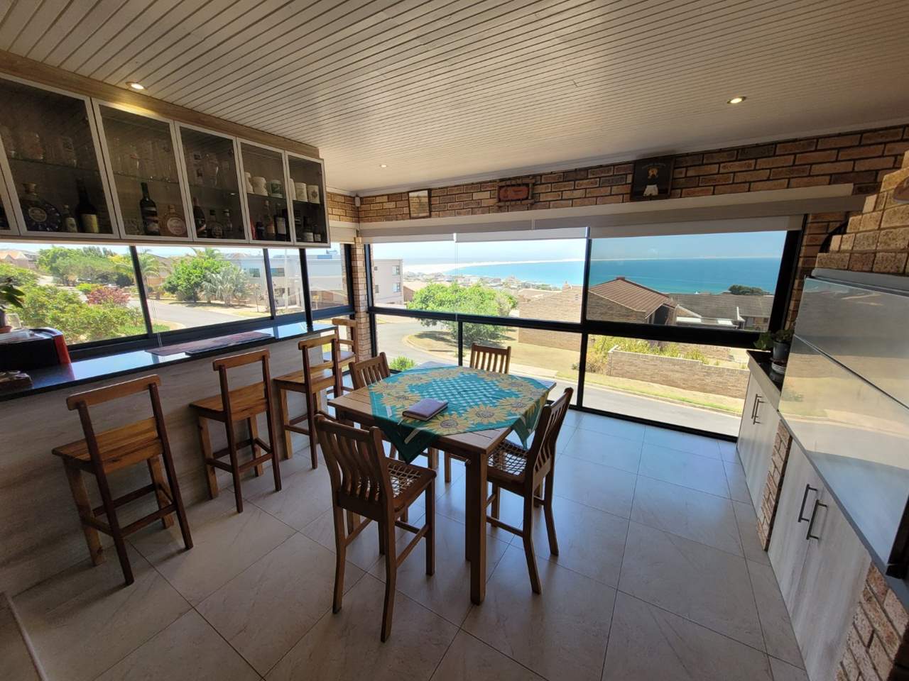 Spacious open-plan lounge flowing into an enclosed patio with bar, built-in stainless-steel braai, and spectacular ocean views — perfect for entertaining
