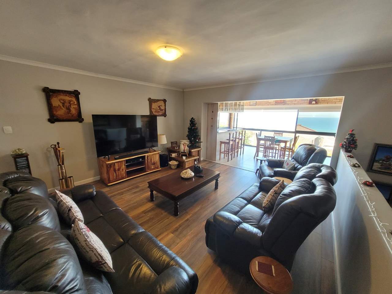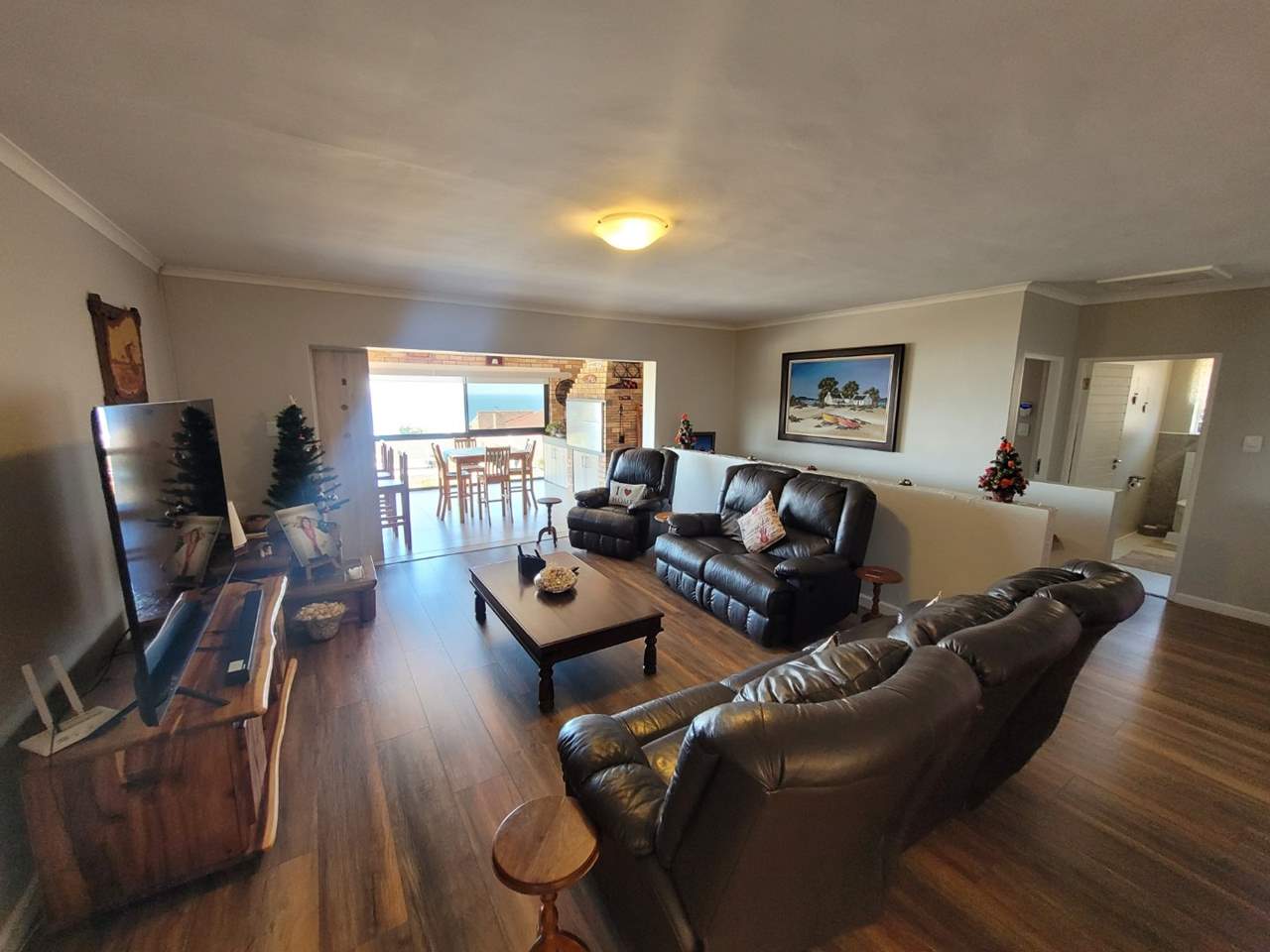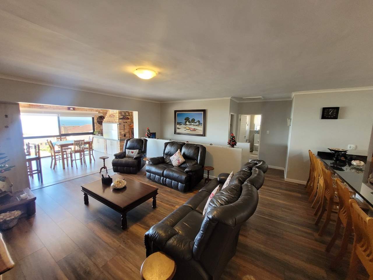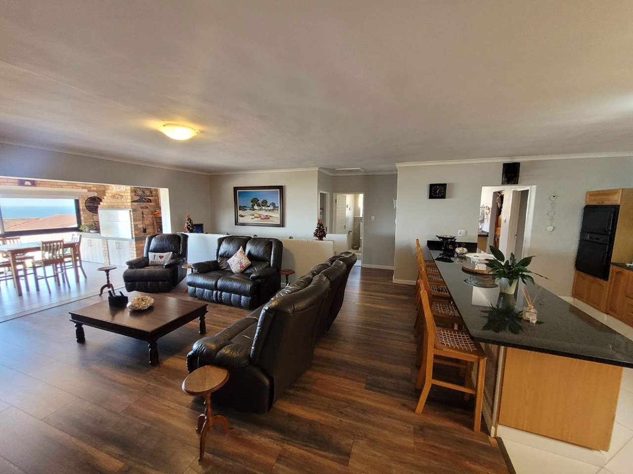 Spacious open-plan lounge flowing into an enclosed patio with bar, built-in stainless-steel braai, and spectacular ocean views — perfect for entertaining