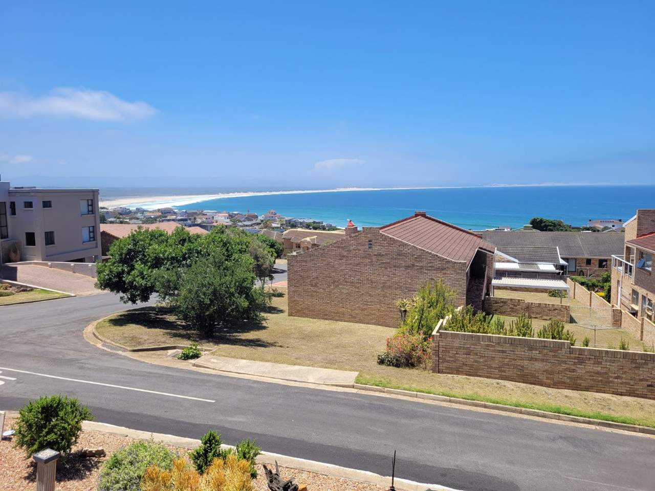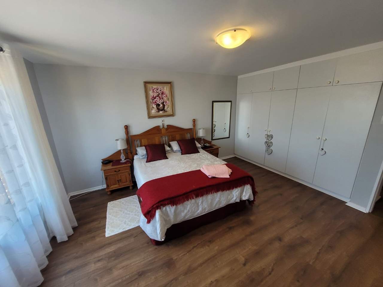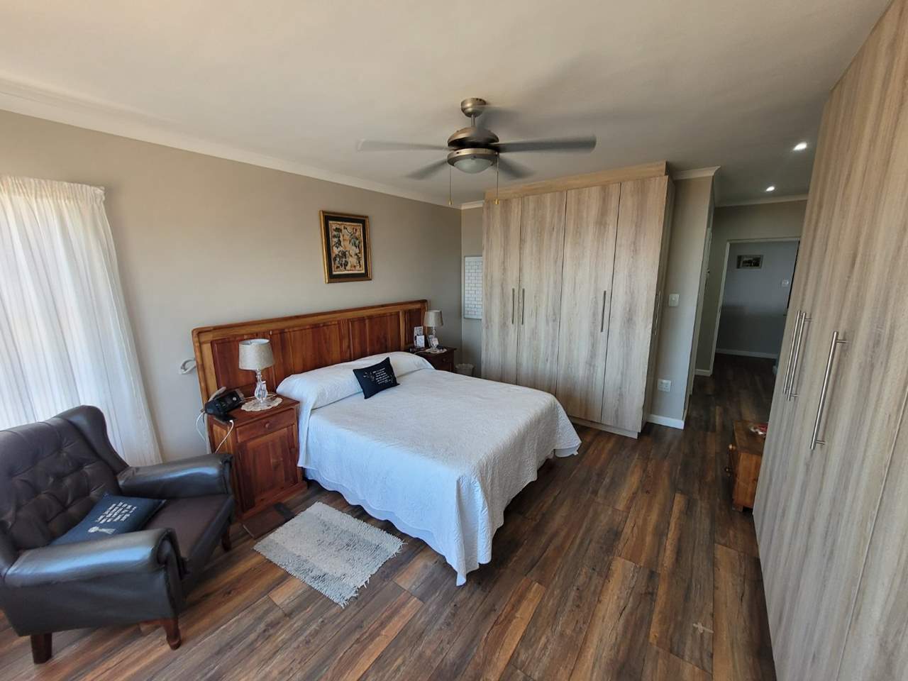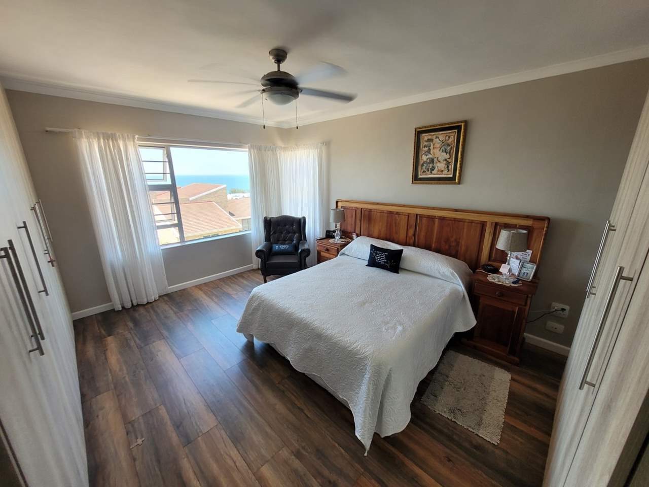 Large main bedroom with sea views, ample built-in cupboards, and a en-suite bathroom
