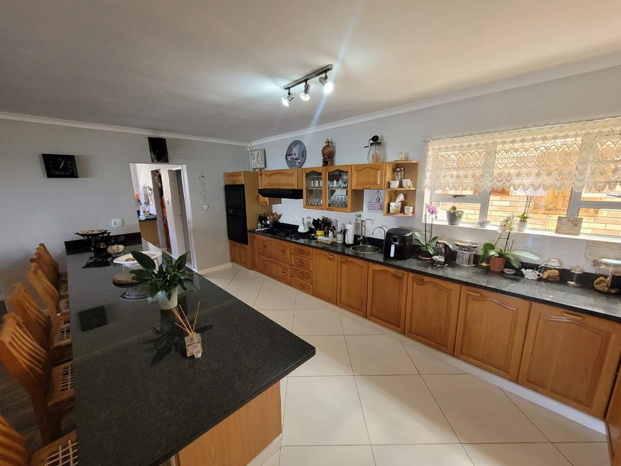 Modern, open-plan kitchen featuring granite counter tops, ample cupboard space, generous work surfaces, and a large separate scullery/laundry
